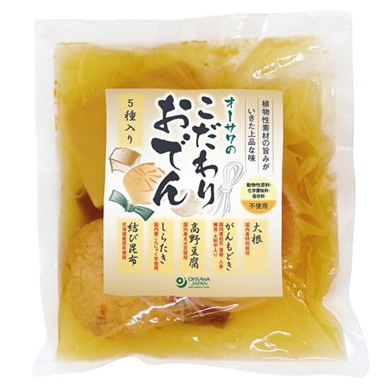 特別栽培大根(国産)、がんもどき[大豆・枝豆・れんこん・にんじん・椎茸・大和芋(国産)、なたね油、食塩(海の精)/にがり(粗製海水塩化マグネシウム)]、高野豆腐[大豆(国産)/にがり]、しらたき[こんにゃく粉/水酸化カルシウム)]、昆布(北海道産)、醤油、本みりん(もち米、米麹、米焼酎)、食塩(天塩)、酵母エキス 内容量 370g