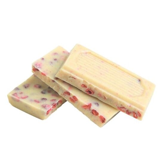 粗糖、ココアバター、ミルクだけのごくシンプルなホワイトチョコに、甘酸っぱく香り高いラズベリーのつぶつぶ果肉がたっぷり