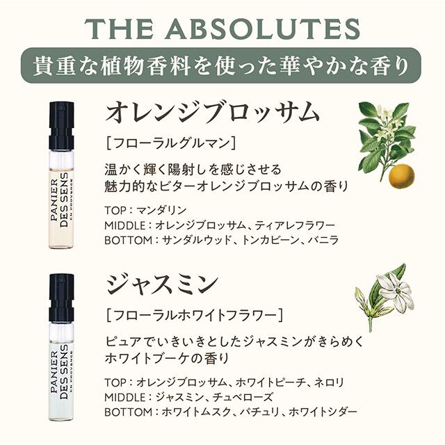 香りの都グラースの調香師が厳選した上質な精油や貴重な植物香料アブソリュートがブレンドされた、フレッシュで華やかな香りが体験できるセット