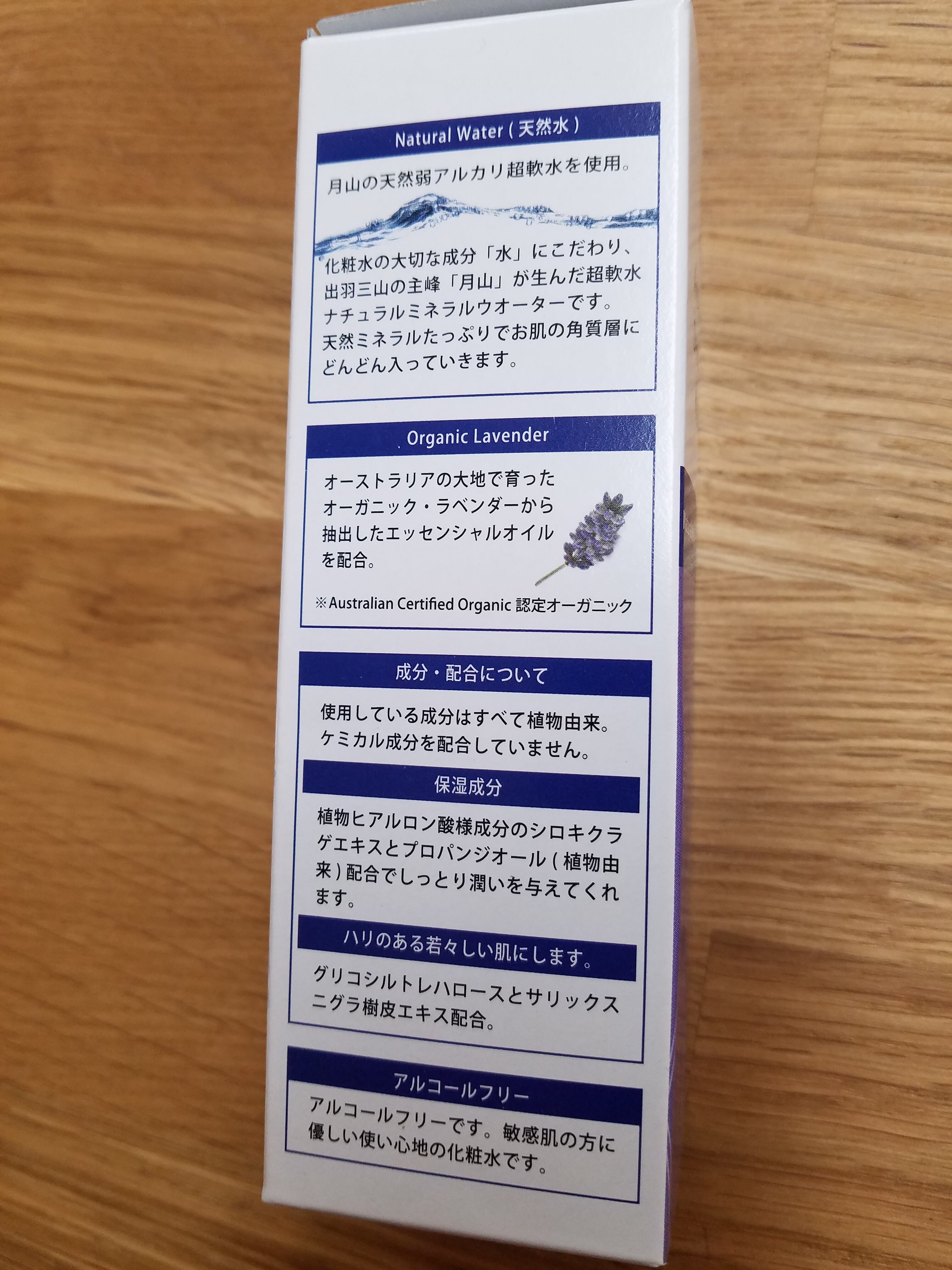 水(天然水)、プロパンジオール(植物由来)、サリックスニグラ樹皮エキス(植物由来) 、ラベンダー油*、グリコシルトレハロース(植物由来)、加水分解水添デンプン 、シロキクラゲエキス、クエン酸(植物由来)