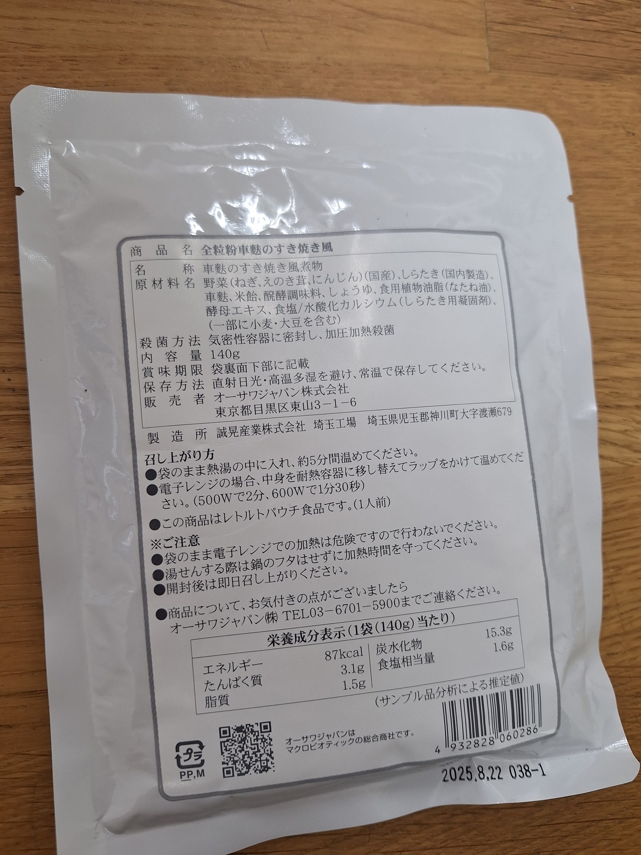 長ねぎ・えのき茸・にんじん・しらたき・オーサワの車麩(国産)、米飴、醗酵調味料、醤油、なたね油、酵 母エキス、食塩(海の精)/水酸化カルシウム(しらたき用凝固剤)